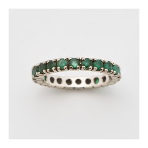 Sortija alianza en oro blanco con esmeraldas talla redonda engastadas en garras.