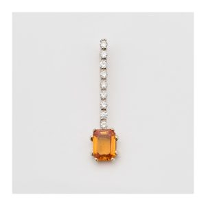 Colgante en oro blanco con barrita de diamantes talla brillante engastados en garras y rematada por un zafiro naranja talla octogonal de 7 x 5 mm, 3 cm.