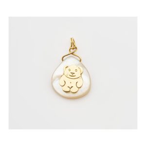 Colgante diseño lágrima en nácar con figura de osito y balía en oro.