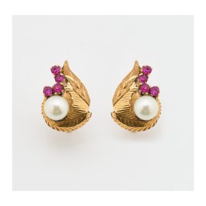 Pendientes en oro mate y brillo con perla cultivada de 5 mm. y símiles de rubí talla brillante engastados en garras.