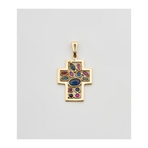 Colgante diseño cruz calada en oro con zafiros azules y rubíes tallas oval, redonda y marquise.