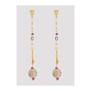 Pendientes largos en oro con cuentas circulares de cuarzo fumé 10 mm, marfilina 5 mm y rubíes de 3 mm.