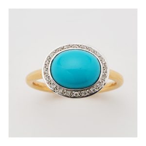 Sortija en oro bicolor con cabujón oval de turquesa de 9 x 7 mm. orlado por diamantes talla brillante.