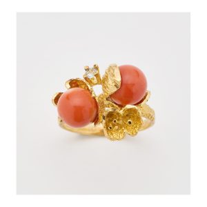 Sortija diseño floral en oro mate y brillo con dos cuentas esféricas de coral de 8 mm. y un símil de aguamarina talla redonda engastado en garras.