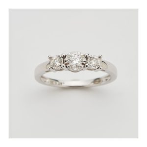 Sortija tresillo en oro blanco con diamantes talla brillante engastados en garras.