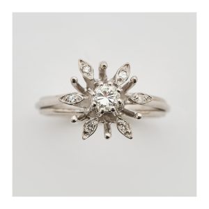 Sortija rosetón diseño flor en oro blanco con diamantes tallas brillante y 8/8.
