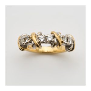 Sortija en oro bicolor con parejas de diamantes talla brillante y motivos diseño cruzado alternados.