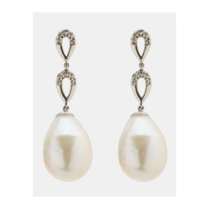 Pendientes largos en oro blanco con dos lágrimas caladas de diamantes talla brillante rematadas por perilla de perla cultivada barroca de 16 x 11 mm.