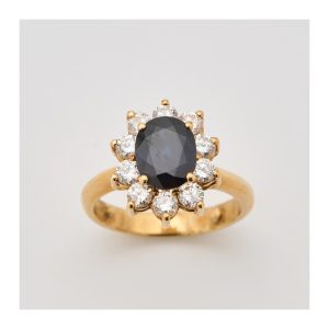 Sortija rosetón en oro con zafiro azul talla oval orlado por diamantes talla brillante.