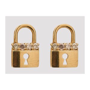 Pendientes diseño candado en oro con diamantes talla brillante.