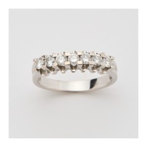 Sortija media alianza en oro blanco con diamantes talla brillante engastados en garras.