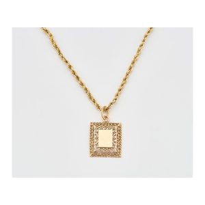 Cadena cordón y placa con marco de filigrana en oro, 2,3 x 1,6 cm.