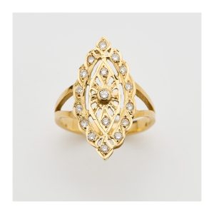 Sortija lanzadera calada en oro con diamantes talla brillante.