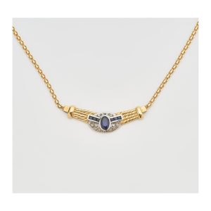Gargantilla con cadena de malla, decoración de cordoncillo y centro de diamantes talla brillante y zafiros azules tallas oval y carré.
