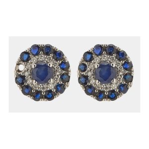 Pendientes rosetón en oro blanco con diamantes talla brillante y zafiros azules talla redonda engastados en garras.