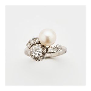 Sortija tu y yo en platino con diamantes talla brillante antigua y 8/8 y perla cultivada de 7 mm.