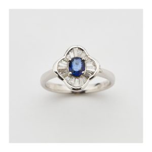 Sortija diseño flor en oro blanco con zafiro azul talla oval orlado por diamantes talla trapecio.