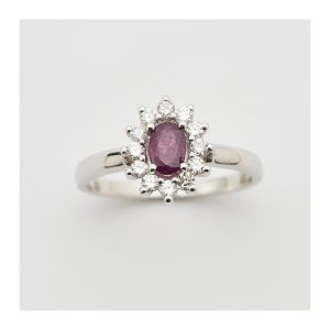 Sortija rosetón en oro blanco con rubí talla oval orlado por diamantes talla brillante.