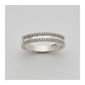 Sortija en oro blanco con frente de diamantes tallas brillante y trapecio.