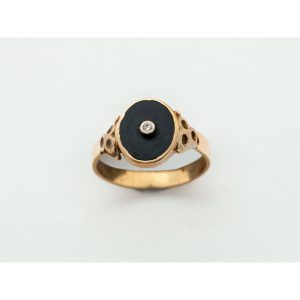 Sortija en oro con ónix talla oval de 12 x 10 mm. y un diamante talla brillante engastado en chatón.