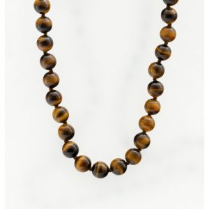 Collar de cuentas esféricas de ojo de tigre 9-9,5 mm. con cierre circular en oro mate y brillo.