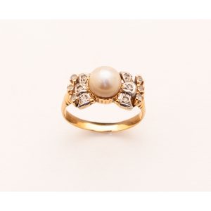Sortija en oro con perla cultivada de 7 mm. y símiles de diamante.