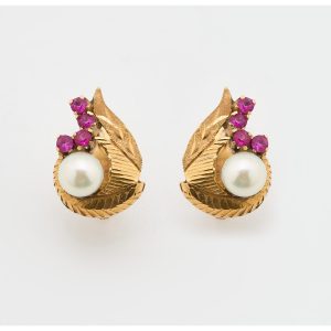 Pendientes en oro mate y brillo con perla cultivada de 5 mm. y símiles de rubí talla brillante engastados en garras.