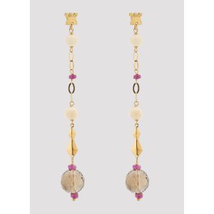 Pendientes largos en oro con cuentas circulares de cuarzo fumé 10 mm, marfilina 5 mm y rubíes de 3 mm.