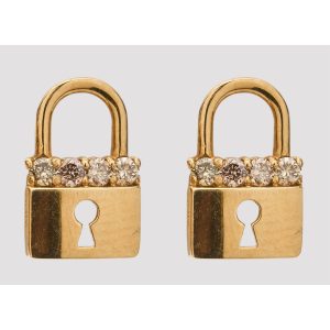 Pendientes diseño candado en oro con diamantes talla brillante.