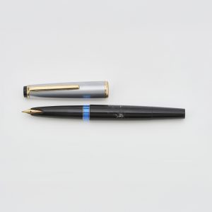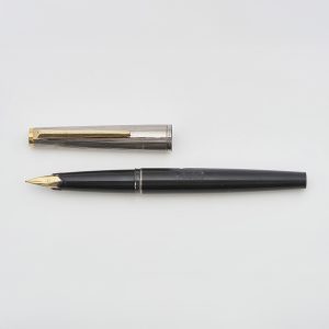 MONTBLANC «Nº32». Estilográfica en acero mateado, resina negra y detalles en plaqué oro, c.1963. Plumín en oro 14K. Sistema de carga por pistón. Estimación:150 – 180€