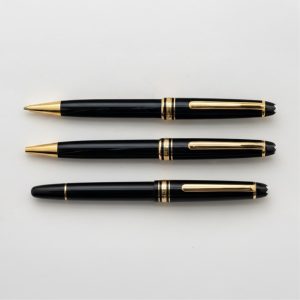 MONTBLANC » Meisterstück. Juego de estilográfica, bolígrafo y lápiz en laca negra con detalles en plaqué oro. Plumín en oro 14K. Sistema de carga por pistón.