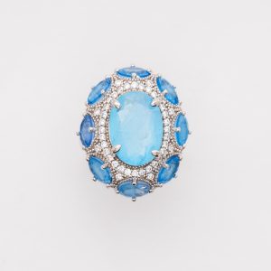 Sortija rosetón en plata rodiada con piedras ornamentales talla oval en color azul de 14 x 10 y 5 x 3 mm. y circonitas.