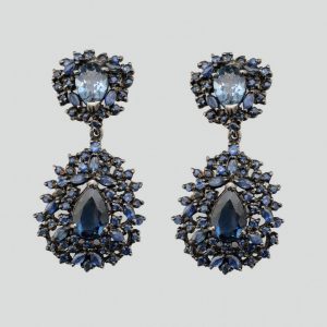 Pendientes largos en plata pavonada con topacios azules talla perilla de 11 x 7 y 12 x 8 mm y tanzanitas tallas redonda y marquise. Estimación:500 – 600€