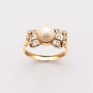 Sortija en oro con perla cultivada de 7 mm. y símiles de diamante.