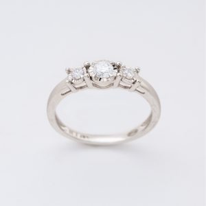 Sortija tresillo en oro blanco con diamantes talla brillante engastados en garras.
