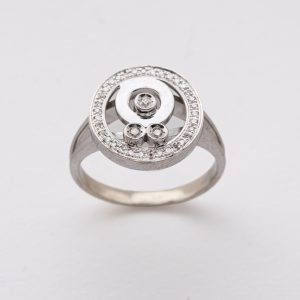 Sortija diseño circular en oro blanco con centro calado, tres chatones de diamantes talla brillante y orla exterior de diamantes talla 8/8.