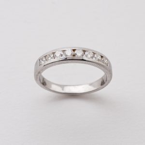 Sortija media alianza en oro blanco con diamantes talla brillante engastados en carril.