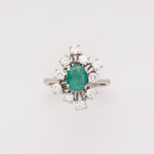 Sortija en oro blanco con esmeralda central talla oval y diamantes talla brillante engastados en garras.