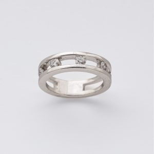 Sortija en oro blanco con centro calado y cinco diamantes talla brillante engastados en carril.