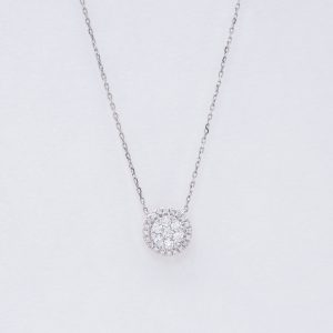Gargantilla en oro blanco con rosetón de diamantes talla brillante engastados en garras.