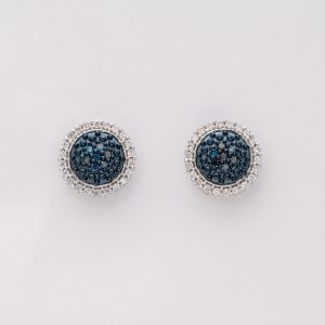 Pendientes en oro blanco con roseton de zafiros azules talla redonda y orla de diamantes talla brillante.