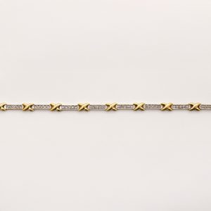 Pulsera en oro bicolor con barritas de diamantes talla brillante.