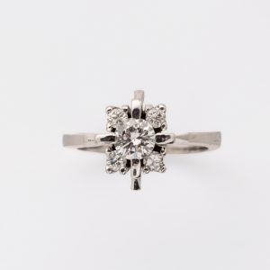 Sortija rosetón en oro blanco con diamantes talla brillante engastados en garras.