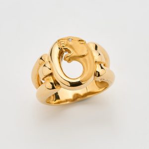 CARRERA Y CARRERA. Sortija calada en oro mate y brillo con centro representando busto de pantera con un brillante en el ojo. Firmada y numerada 245042.
