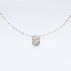 Gargantilla de cadena en acero con bolitas y cierre mosquetón en oro y colgante oval en oro blanco cuajado de diamantes talla brillante, 1,9 x 1,4 cm.