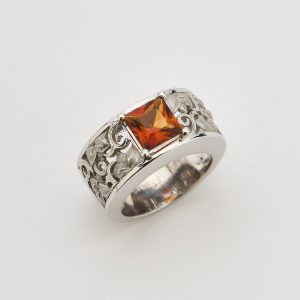 CARRERA Y CARRERA. Sortija en oro blanco mate y brillo con citrino central talla carré de 7 x 7 mm. y brazos calados con motivos florales. Firmada y numerada: 33 84 19.