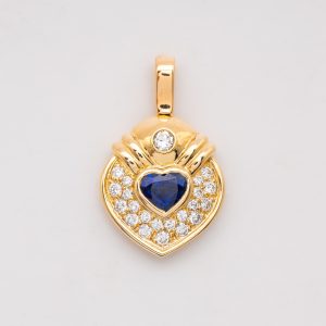 Colgante en oro con zafiro azul talla corazón y diamantes talla brillante.