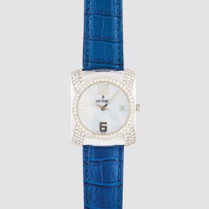 VICTORIA. Reloj de pulsera para señora. En acero y correa de piel. Caja y bisel de diamantes talla brillante. Esfera con numeración arábiga. Calendario fecha a las 3. Mecanismo de quartz.