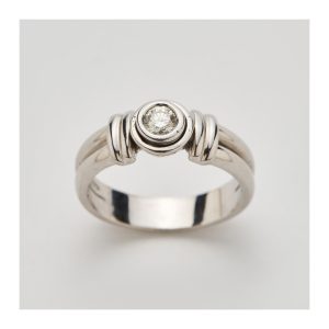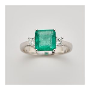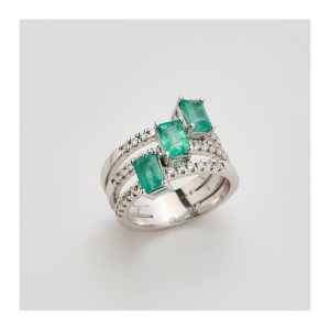 Sortija en oro blanco con centro cuadrado y brazos de diamantes talla brillante.