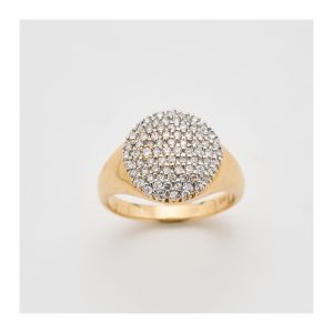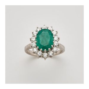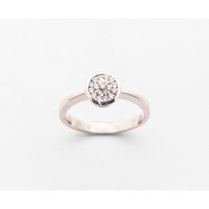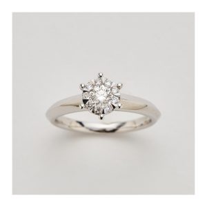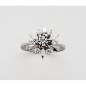 Sortija rosetón en oro blanco con diamantes talla brillante engastados en garras.